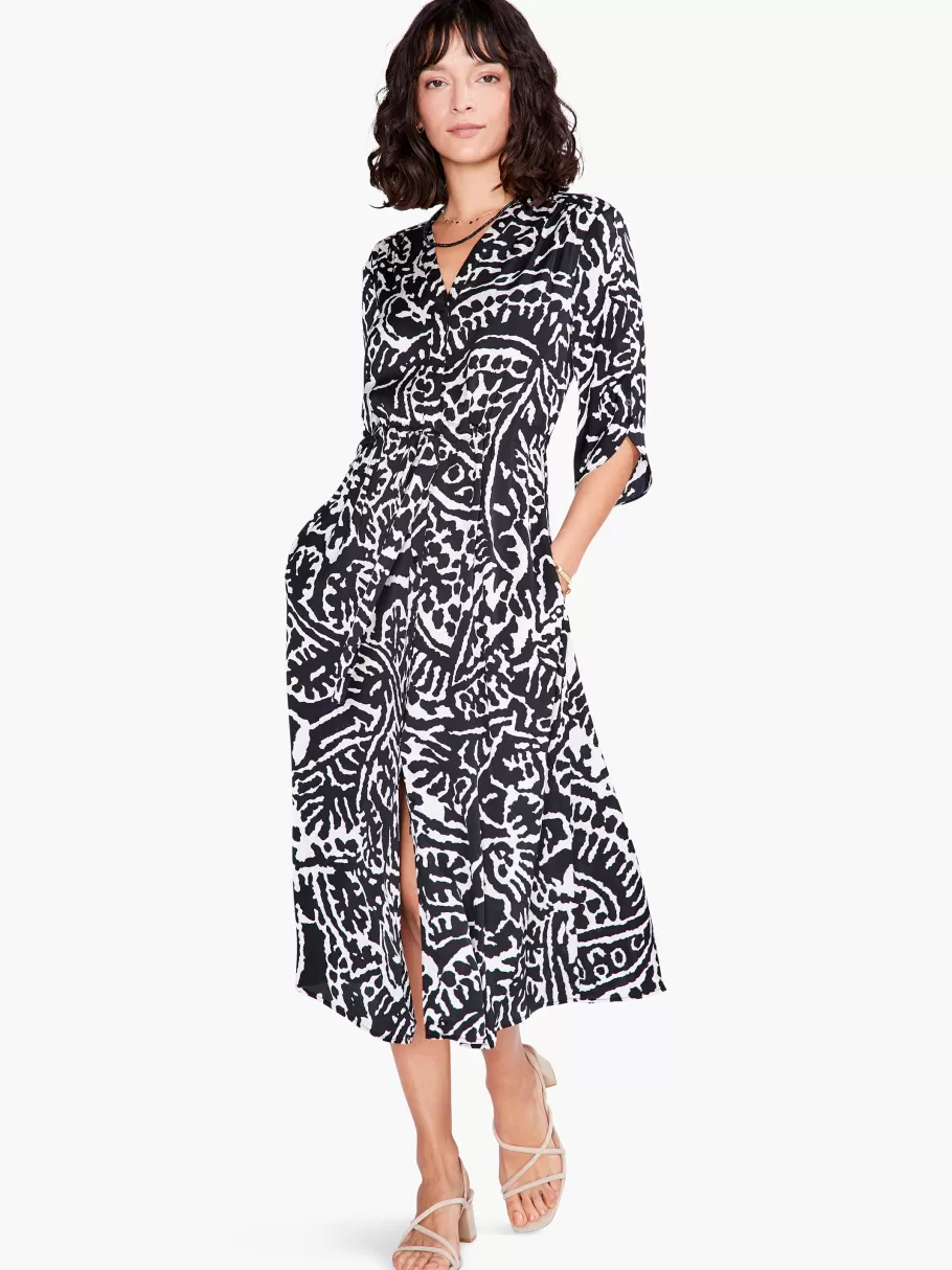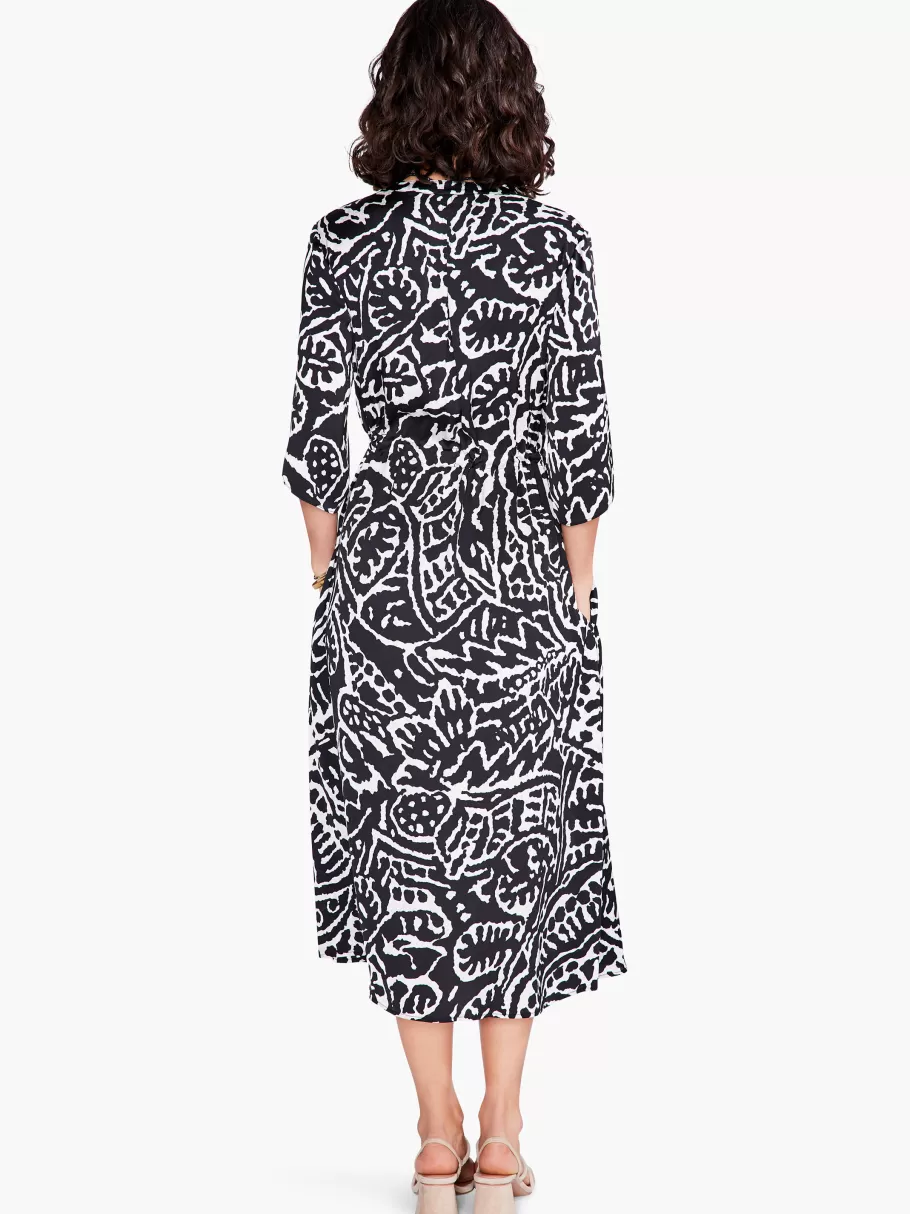 A Bold Black And White Pattern That’Ll Make An Impression From Coffee To Cocktails. We Gave It A Stylish Silhouette To Match The Pattern, Featuring A Waist Band That Brings The Material In At The Waist To Create A Flattering, Feminine Shape. With Elbow Length Split Sleeves, A V-Neck Collar And With Side Seam Pockets. We Designed The Hem To Fall Below The Knee.
